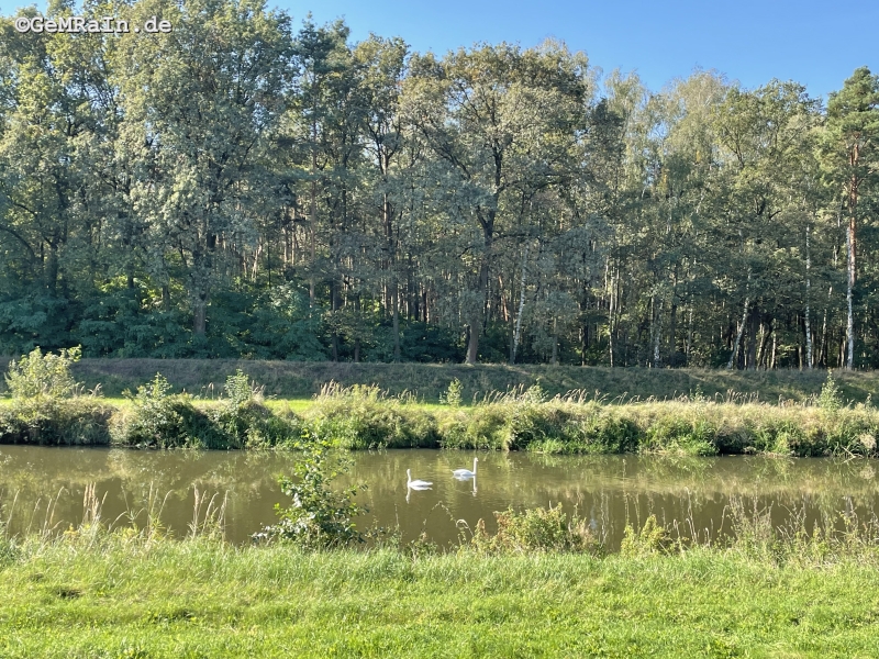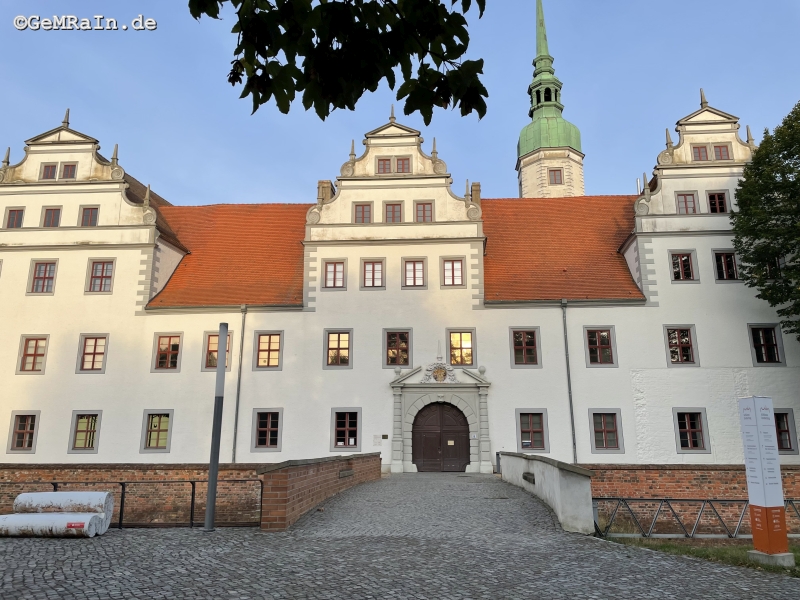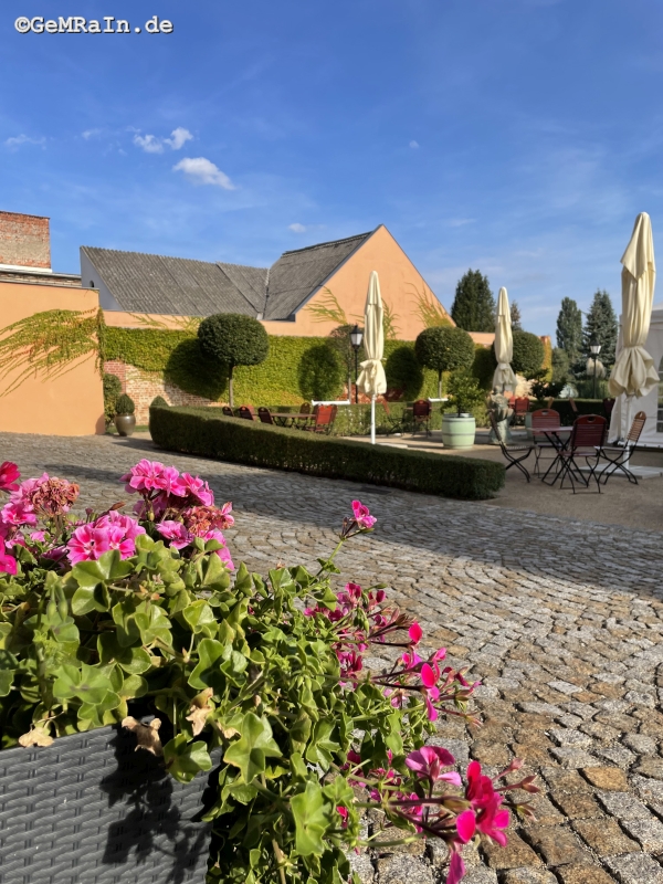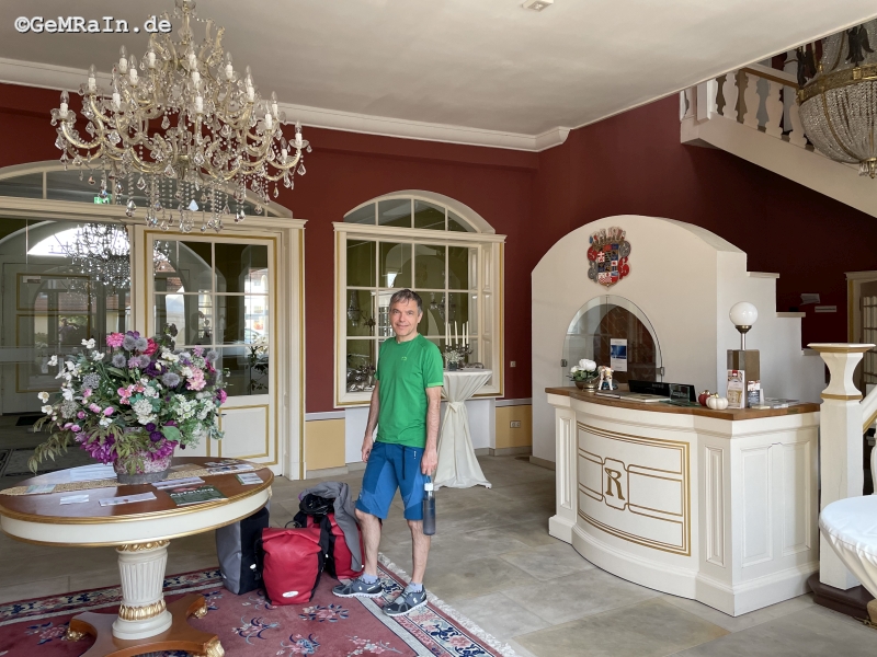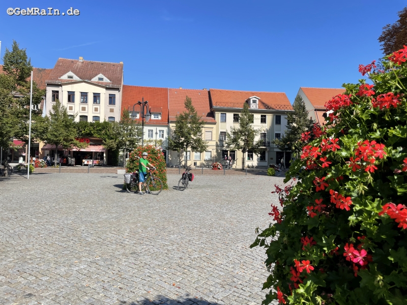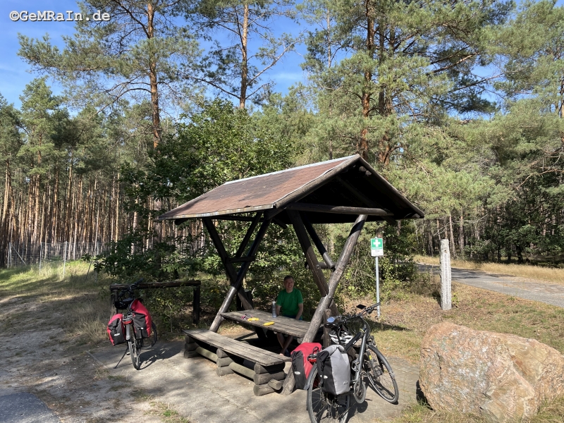 Idyllisch an der schwarzen Elster ging es weiter. Links schwammen Schwäne, rechts gab es Wiesen mit Kühen oder Schafen. Regelmäßig fuhren wir auch unter Birken oder Eichen Alleen durch. Kurze Kaffeepause im schönen Städtchen Bad Liebenwerda. Bei unserer nächsten Pause mitten im Wald gab es eine Steinsäule, die den Mittelpunkt des Landkreises Elbe Elster auswies. In Doberlug waren wir feudal in einem Herrenhaus in der Nähe des Schlosses Doberlug untergebracht, der Schlosspark mit dazugehöriger Kirche lud zum Barfußgehen ein.