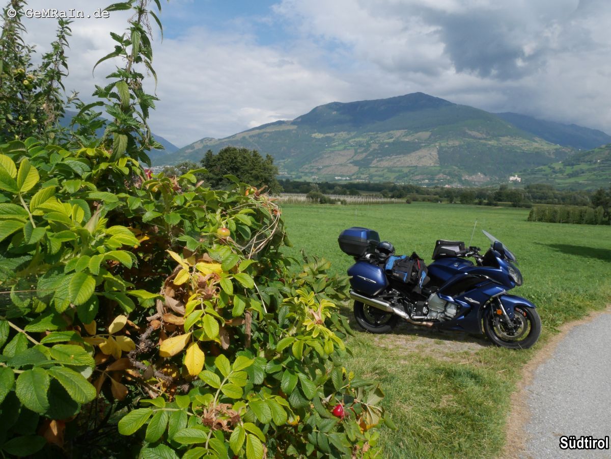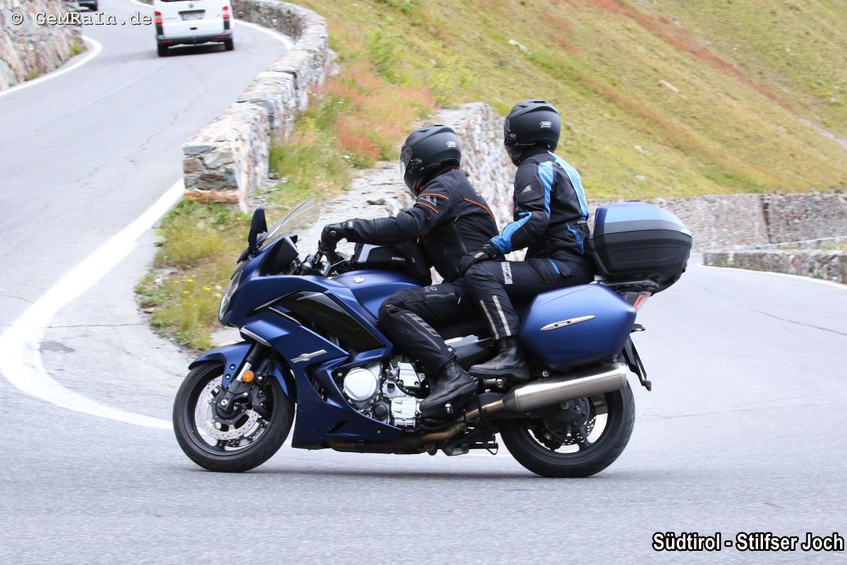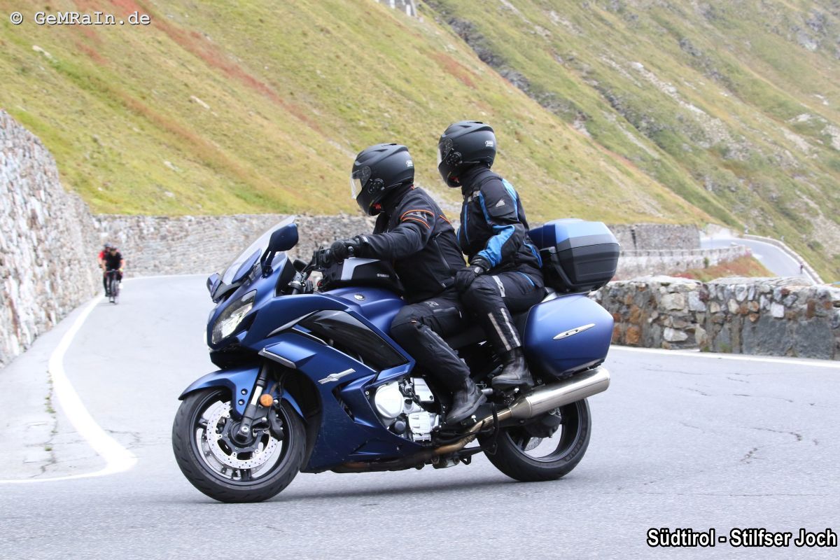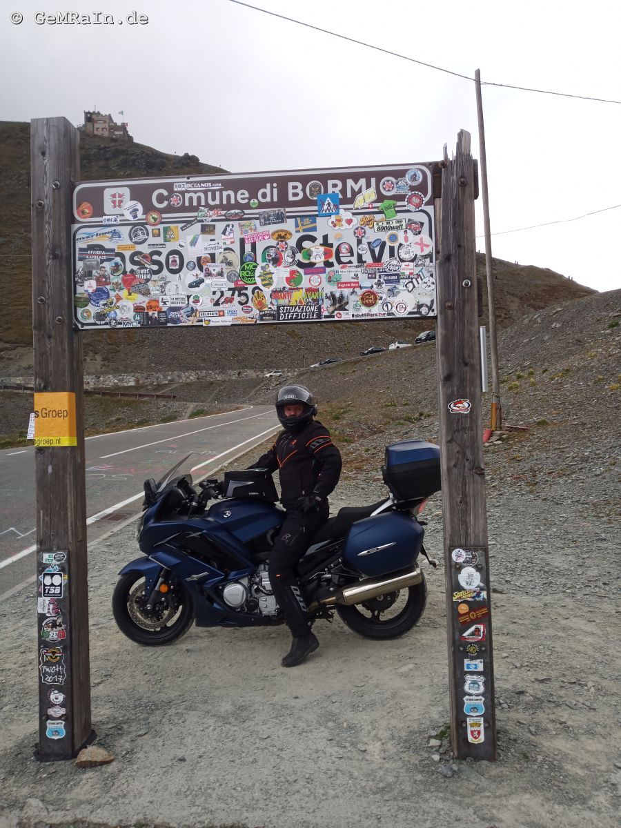 Unser erster Urlaubstag, jippieh. Trotz guter Wettervorhersage hat uns der Regen in der Früh überrascht. Aber wir sind ja hart im Nehmen. Über die Garmischer Autobahn Richtung Ehrwald, Fernpass, Imst, Landeck, Reschenpass und dann kurz nach Mittag Auffahrt zum Stilfser Joch (Höhe 2.757m). Nach 17 Jahren wieder gemeinsam über diesen Pass. Ich weiß nicht, warum ich beim ersten Mal nicht schreiend vom Motorrad gehüpft bin. Das ist ja sowas von sch… gefährlich. Vielleicht liegt es aber auch an der größeren Maschine😉. Auf jeden Fall gibt’s dort extrem enge Kehren (48 Kehren von der Nordseite) und ich glaube, das mache ich so schnell nicht wieder mit.