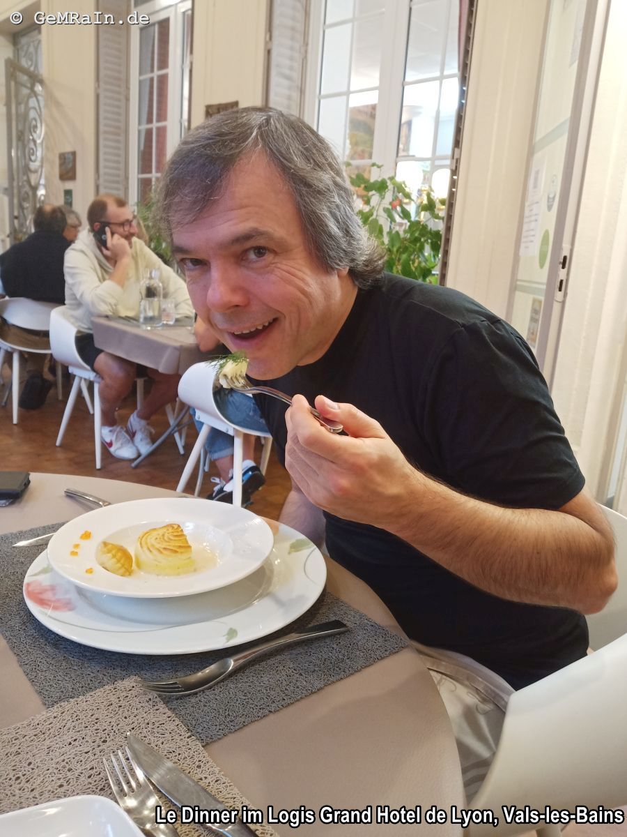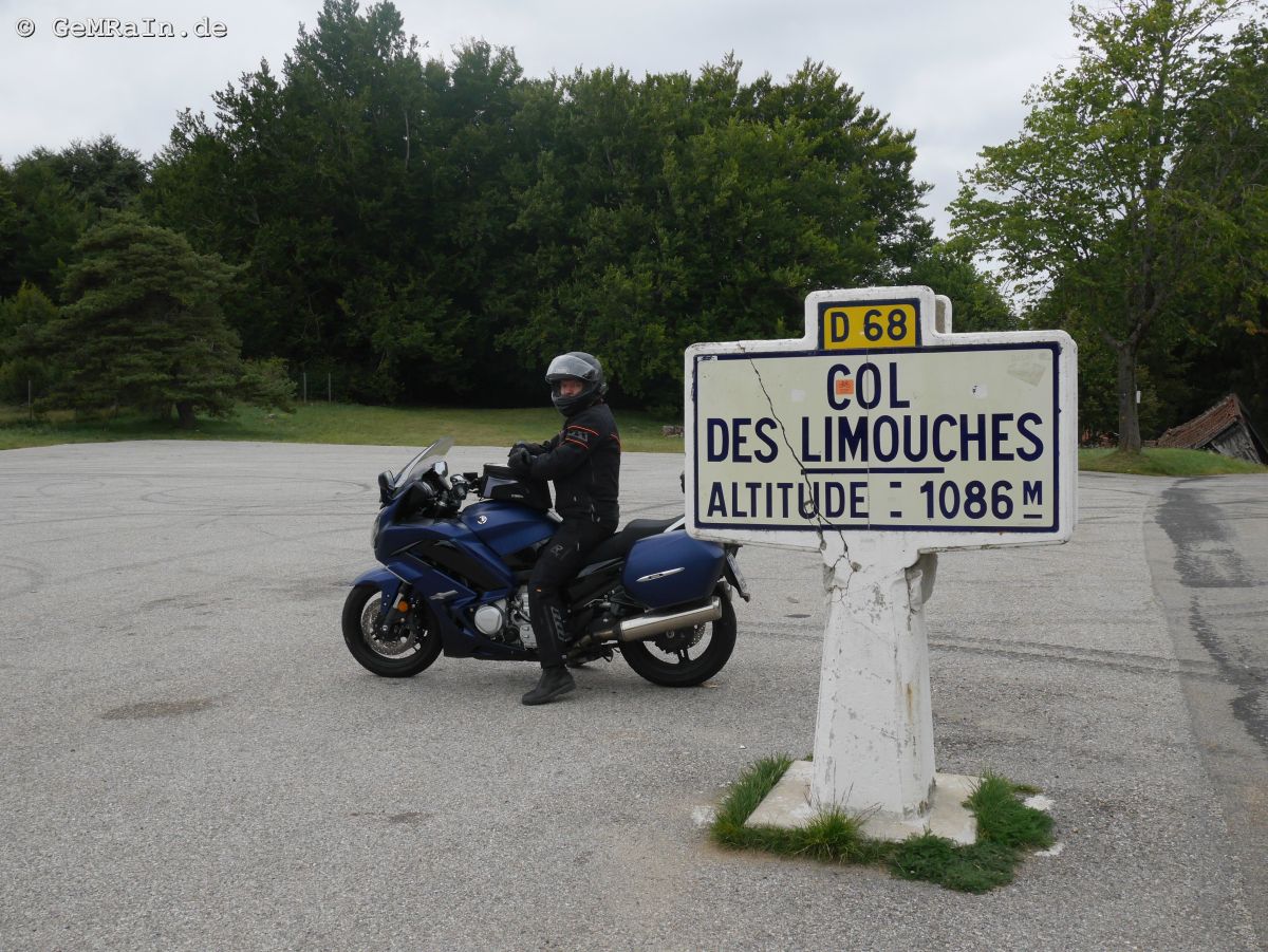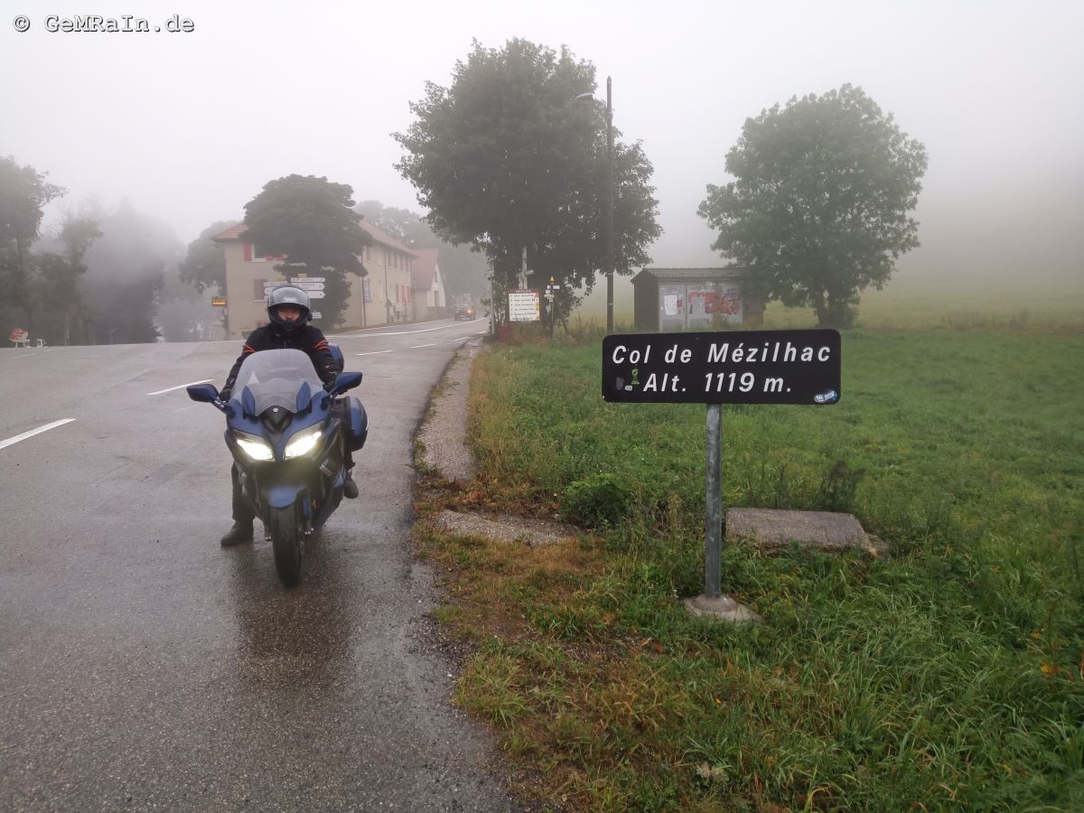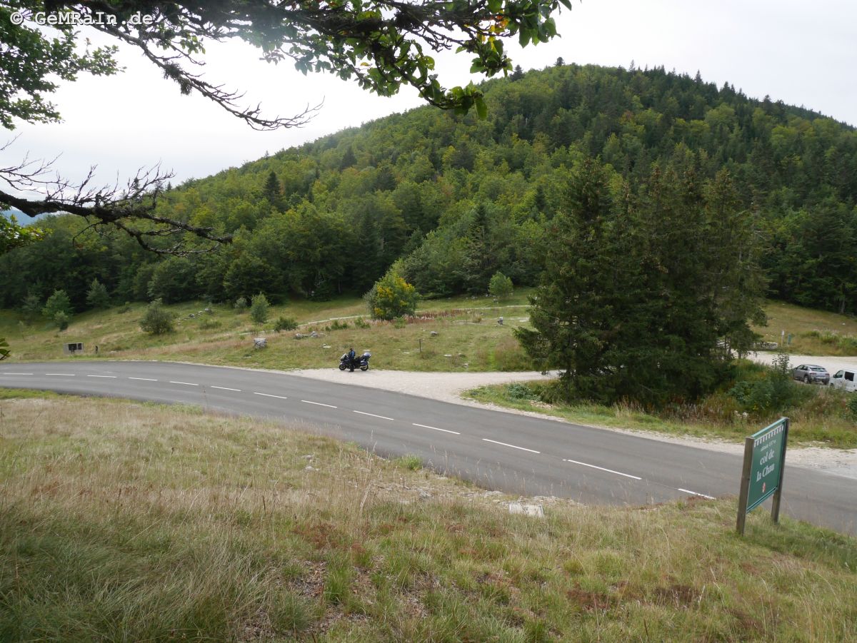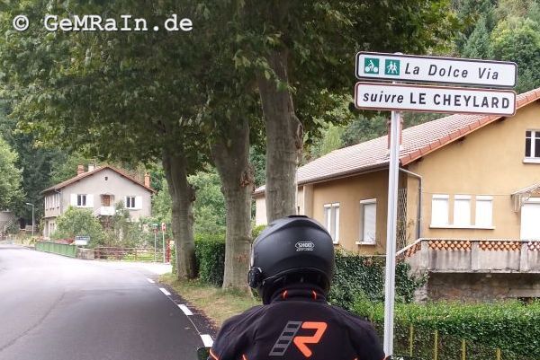 Die Landschaft öffnet sich in ein weites Tal und wir haben unseren ersten Pass, Col de Proncel (1.100m). Links von uns erstreckt sich eine lange Bergkette, der Wind pfeift heute richtig stark. Aber der Wind kann uns nicht stoppen, es geht weiter auf den Col de la Chau (1.337m). Der Col de la Bataille (1.313m) ist eine Wucht! Diesen Pass muss man gesehen haben. Rechts und links erstreckten sich Täler nach unten und in das Land, daneben gibt’s Steilwände und riesige Bergmassive. Weitere Pässe: Col des Limouches (1.086) und Col de Mezilhac (1.119m). Über dem Weg „La Dolce Via“ ging es dann auf zum letzten Pass (Col de Mezilhac), dort hat uns ein ganz schrecklicher Nebel mit Nieselregen erwischt. Und das noch nicht schlimm genug, auch die Straße hat von losem Kiesel nur so gestrotzt. Nebel vorbei und weiter gings nach Vals-les-Bains. Den Tag haben wir mit einem vorzüglichen Menü und genügend Wein im Hotel abgeschlossen.