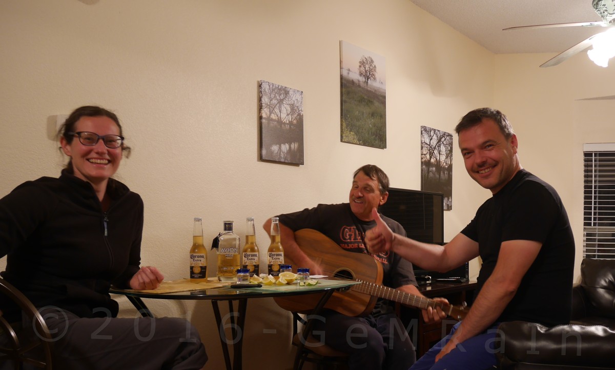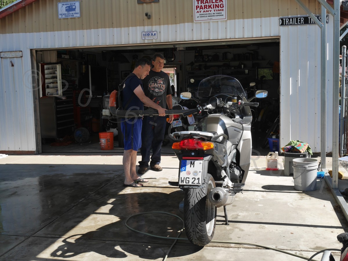 14.06.-19.06.: Diese Woche stand ganz im Zeichen von Entspannung und kulinarischen Highlights. Das war mit einem schönen, schattigen Garten sowie mit Selbstversorgung leicht zu bewerkstelligen. Bei der Entspannung darf ein Lese-Nachmittag unter den Bäumen nicht fehlen und bei den kulinarischen Highlights muss natürlich ein Doughnut und ein Steak dabei sein. Das i-Tüpferl der Woche bekamen wir nach einem gemeinsamen, gemütlichen und feucht-fröhlichen Samstag-Abend mit unserem Vermieter Bill. Wir haben zusammen seinen Bier- und Tequilavorrat dezimiert. Anschließend war er so nett, uns seine große Garage mit einer immensen Ausrüstung zur Verfügung zu stellen, um unser Motorrad wieder auf Hochglanz zu bringen. Waschen und Fönen (des Motorrads) inklusive.