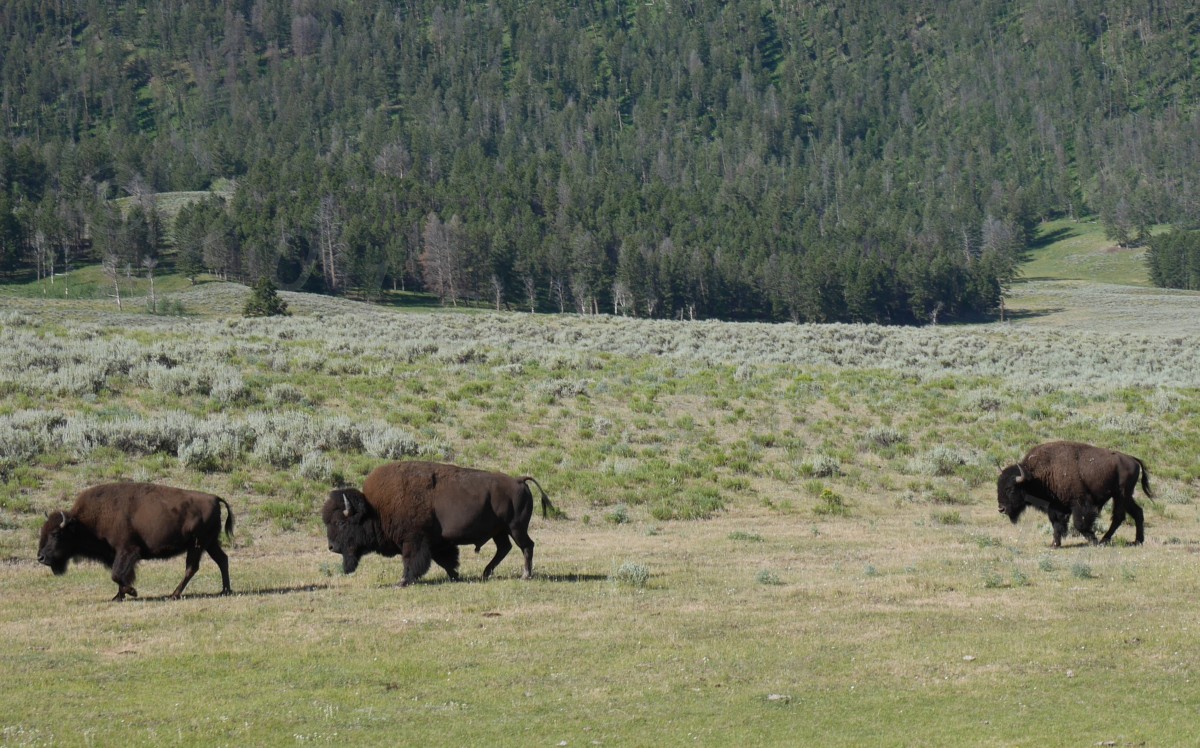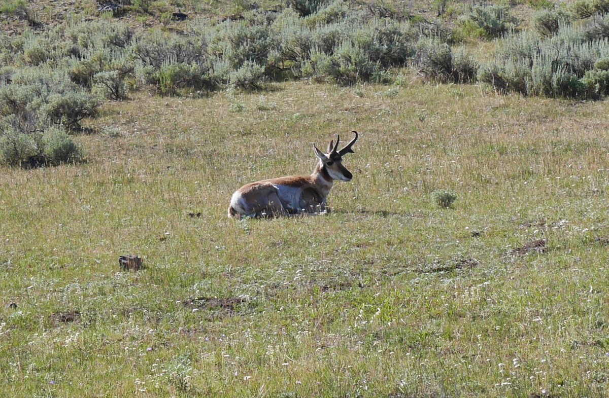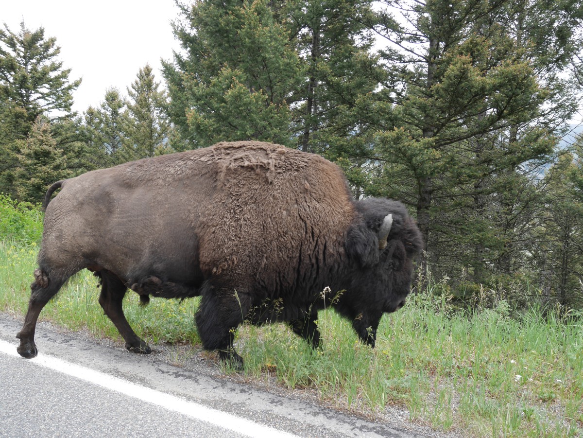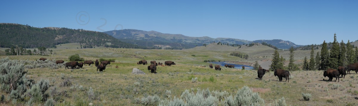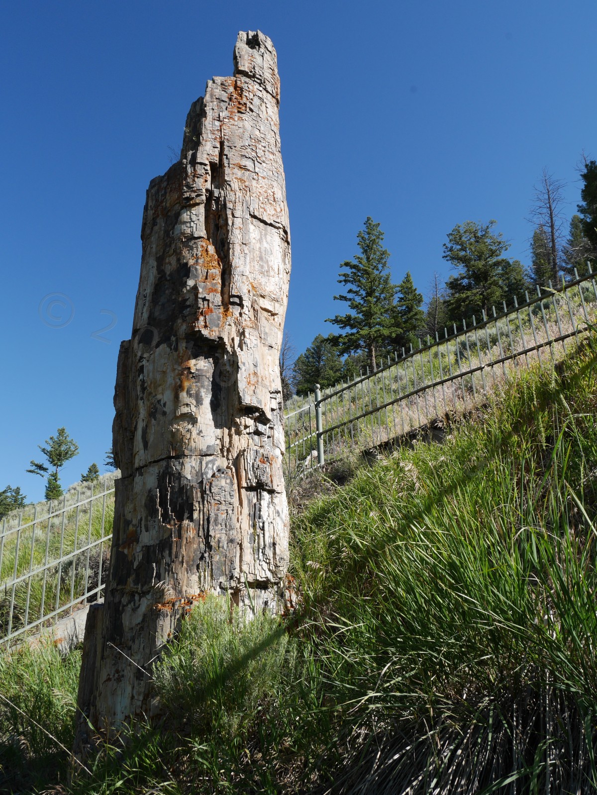 14.07.: Ausflug ins Lamar Valley: Bereits nach den ersten Kurven im Valley haben wir ein Pronghorn entdeckt. Als Ines das Pronghorn fotografierte näherte sich von hinten ein wirklich, wirklich großes Bison. Da Ralf nix besseres zu tun hatte, dies Ines mitzuteilen, war die Foto-Einheit ziemlich schnell zu Ende. Ines sprang auf das Motorrad und wir düsten los. Eine Minute später sahen wir eine große Bison-Herde, die sich ganz gemächlich durch die Prärie bewegte. Da bereits einige Leute auf der Wiese beim Fotografieren standen, hatten wir auch kein Problem uns dazu zu gesellen und fühlten uns sicher. Unser Gedanke: Wenn die auf uns zulaufen, wird es schon nicht uns erwischen. Auf den nächsten 20 km haben wir noch einige, zum Teil riesengroße Bisonherden gesehen. Was für ein Anblick! Einige Bisons überquerten die Straße und verursachten einen Stau. Dann sind wir noch zu einem bekannten Beobachtungspunkt für Wölfe gefahren, konnten aber leider keine entdecken. Auf unserem Rückweg sind wir über einen kleinen Abstecher zu einem versteinerten Redwood-Baum gefahren.