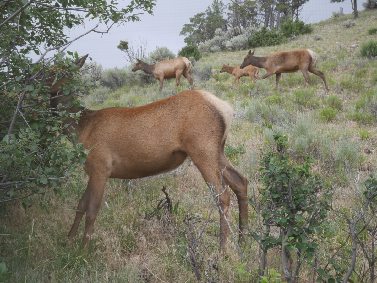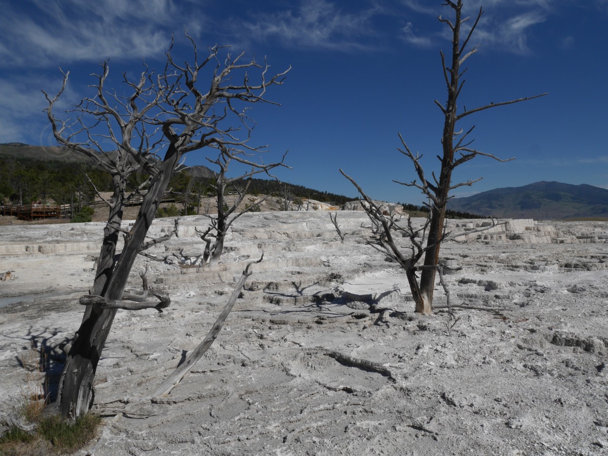 11.07.: Von Cody fuhren wir erstmal den Wyoming-Highway 296 bei starkem Wind und fiesen Böen Richtung North-East Entrance Yellowstone. An der Junction 212 sind wir ein kurzes Stück östlich zum Beartooth Lake und Beartooth Pass gefahren. Bei Minus 1 Grad und Schneegestöber (Frage von Ines: Warum tue ich mir das an?) war die Straße ca. 1 Meile vor dem Pass gesperrt. Also drehten wir um und fuhren zu unserem Tagesziel durch den nördlichen Teil des Yellowstones (Lammar Valley) nach Mammoth Hot Springs. Im Lammar Valley haben wir nach wenigen Metern unsere erste Bison-Herde gesehen. Nachdem wir auch noch etliche Tiere, darunter Elche und Coyoten gesehen haben kam uns plötzlich auf der Straße ein Bison entgegen. Ein wenig unwohl fühlten wir uns schon als es uns auf unserer Höhe direkt anschaute – Ines hatte den Foto griffbereit und hat den für uns beeindruckenden Moment festgehalten. Unsere Unterkunft für die nächsten 5 Nächte ist ein Bungalow mit Blick auf die Mammoth Hot Springs. Elche können wir von unserer Terrasse aus ebenso beobachten wie die massenhaft vorhandenen ground squirrels (Erdhörnchen).