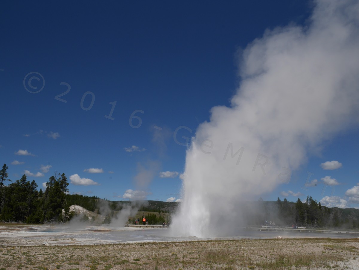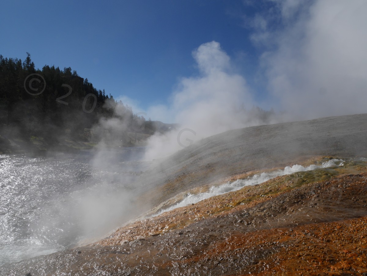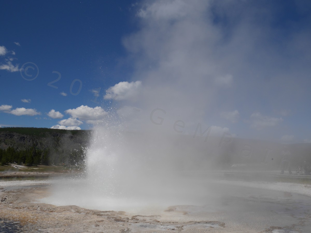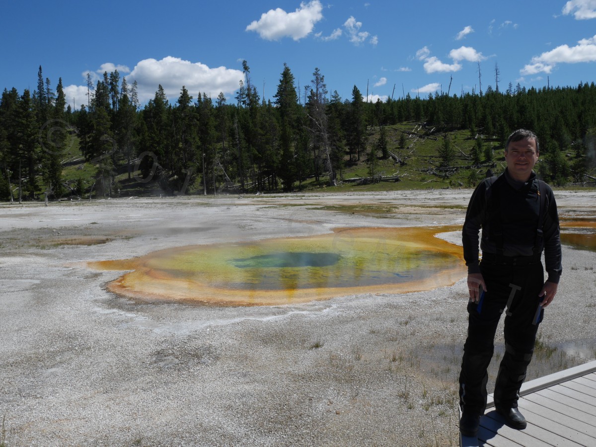 12.07.: Ausflug Old Faithful: Was für ein genialer Ort! Auf unserem Weg zum südlichen Teil des Yellowstone-NPs fuhren wir durch geradezu mystische Landschaften, durch Wiesen und Wälder mit immer mal wieder aufsteigenden Dampf-Wolken. Pünktlich zum Ausbruch (Eruption) von Old Faithful sind wir dort eingetroffen und haben uns nach einem ausführlichen Foto-Stop auf den Geysire-Rundweg gemacht, um dort die nächsten Foto-Sessions einzulegen. Kleine, große, bunte, ruhende, blubbernde, bizarr geformte, wunderbar farbige – die Auswahl ist schier grenzenlos. Wir durften heute drei ausbrechende Geysire beobachten und zudem ein zweites mal Old Faithful. Was für ein genialer Tag! Auf dem Rückweg haben wir noch zwei kleinere Abstecher mit dem Motorrad zum Firehole Lake Drive-Loop und zum Firehole Canyon Drive-Loop gemacht.
