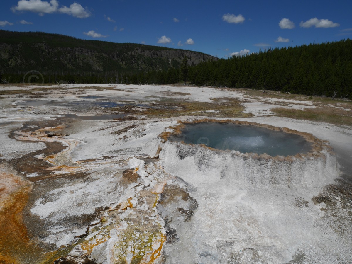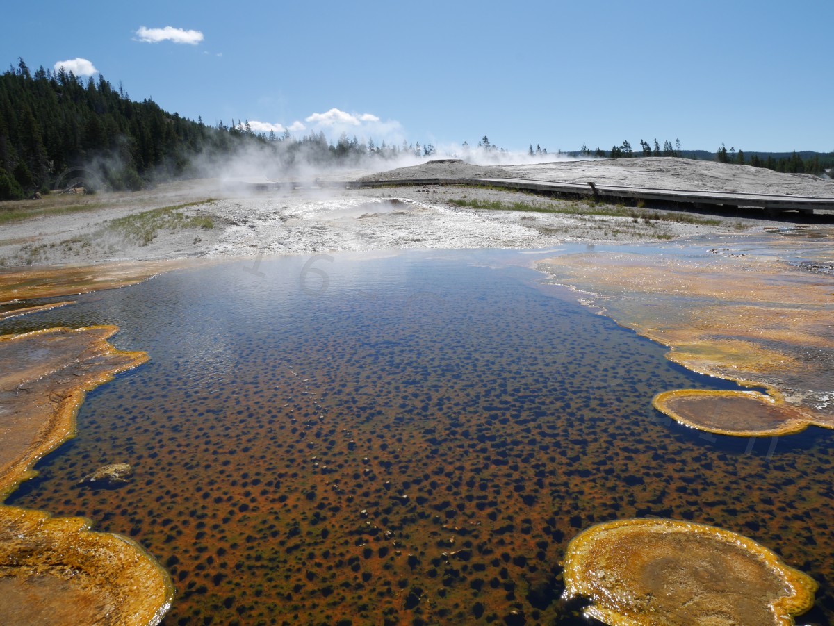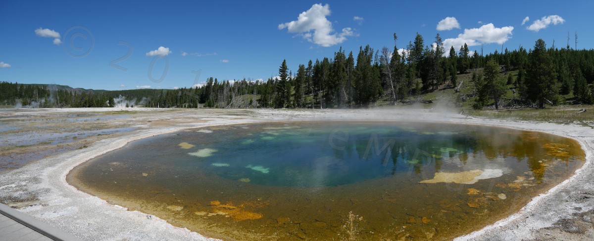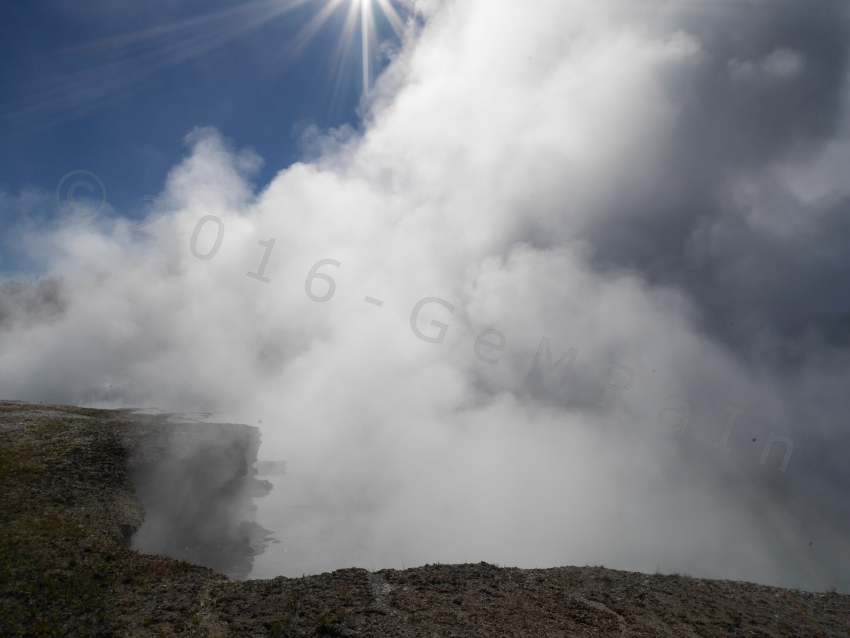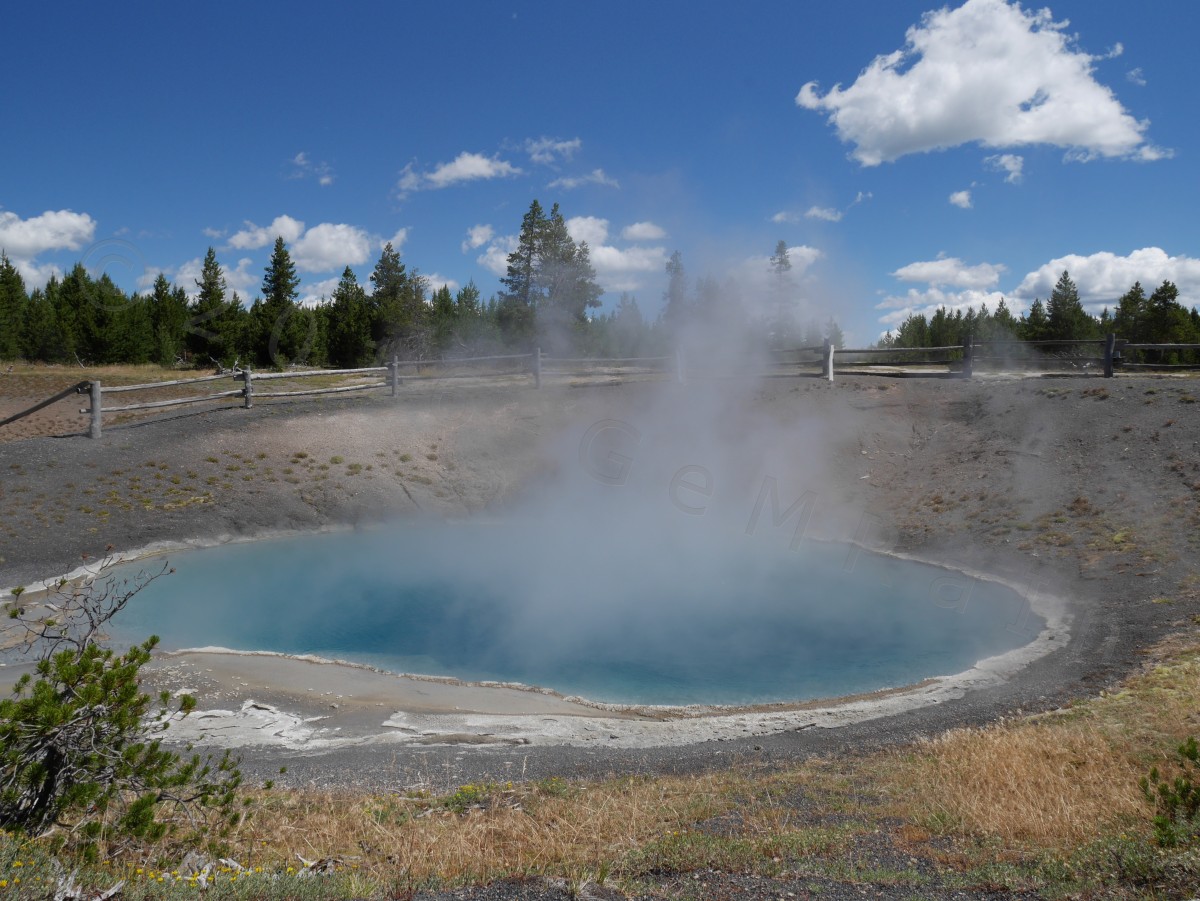 12.07.: Ausflug Old Faithful: Was für ein genialer Ort! Auf unserem Weg zum südlichen Teil des Yellowstone-NPs fuhren wir durch geradezu mystische Landschaften, durch Wiesen und Wälder mit immer mal wieder aufsteigenden Dampf-Wolken. Pünktlich zum Ausbruch (Eruption) von Old Faithful sind wir dort eingetroffen und haben uns nach einem ausführlichen Foto-Stop auf den Geysire-Rundweg gemacht, um dort die nächsten Foto-Sessions einzulegen. Kleine, große, bunte, ruhende, blubbernde, bizarr geformte, wunderbar farbige – die Auswahl ist schier grenzenlos. Wir durften heute drei ausbrechende Geysire beobachten und zudem ein zweites mal Old Faithful. Was für ein genialer Tag! Auf dem Rückweg haben wir noch zwei kleinere Abstecher mit dem Motorrad zum Firehole Lake Drive-Loop und zum Firehole Canyon Drive-Loop gemacht.