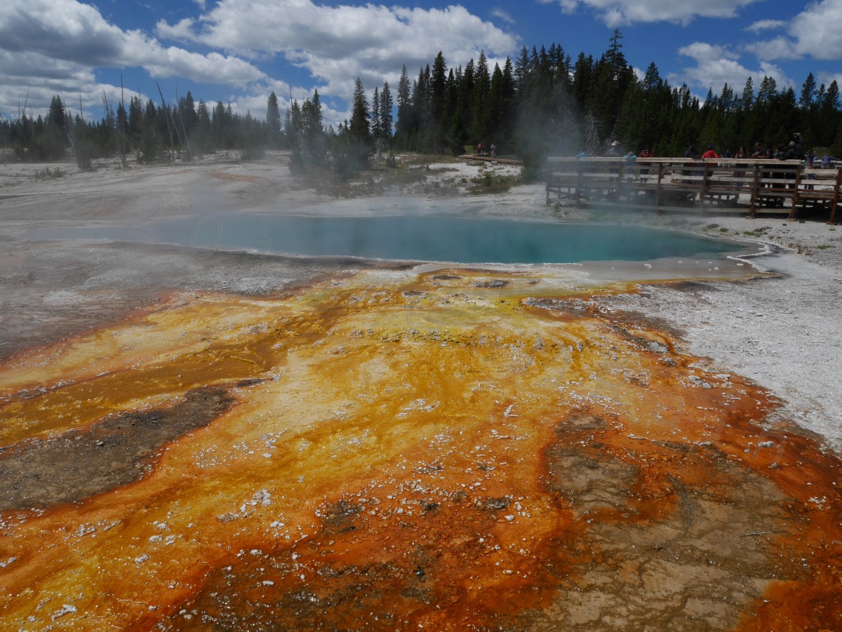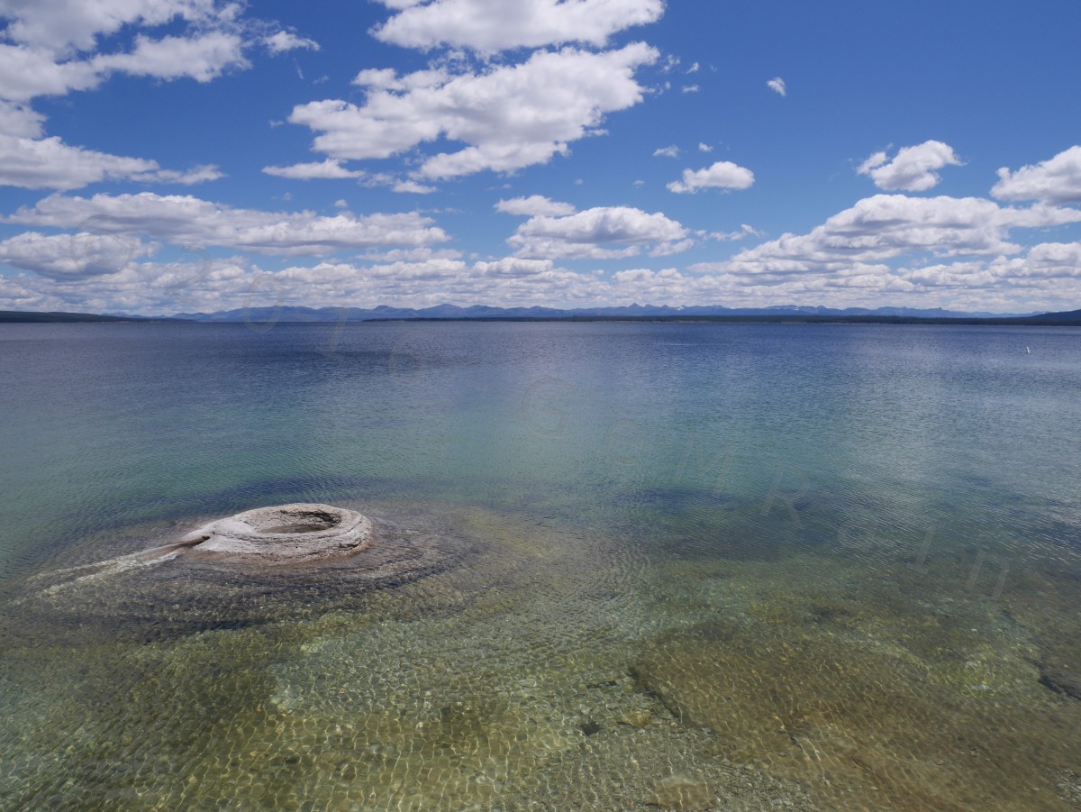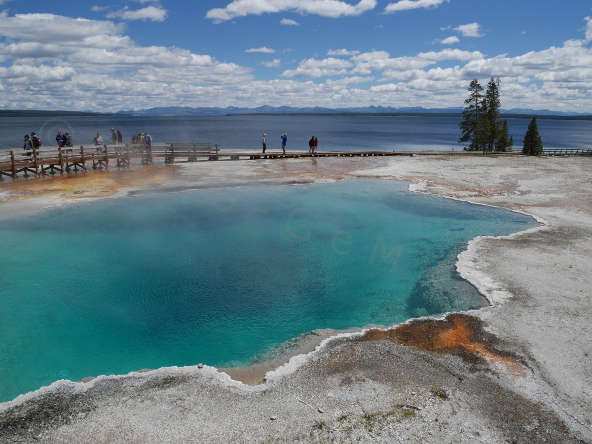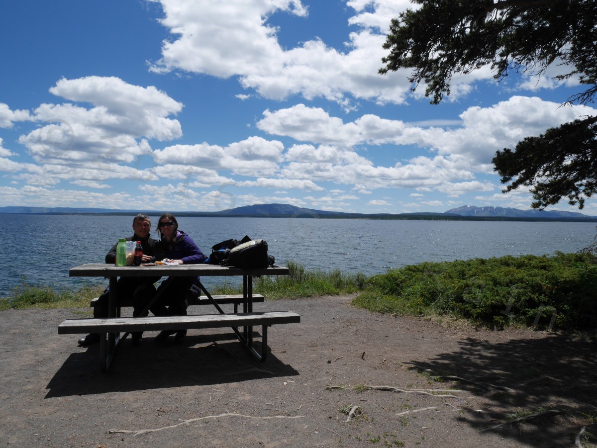 13.07.: Ausflug zum Grand Prismatic Spring und West Thumb: Morgens ging es wieder Richtung Süden, um noch vor den Menschenmassen am Ziel zu sein. Aber das war wohl nix. Als wir um 9 Uhr am Parkplatz ankamen, quoll dieser schon regelrecht über. Glücklicherweise haben wir mit dem Motorrad noch ein kleines Plätzchen ergattern können und schon machten wir uns mit zig anderen Leuten auf zum Grand Prismatic Spring. Die Farben sind unbeschreiblich! Zum Glück verlaufen sich die Menschenmassen ganz gut und so konnten wir uns auch später ohne Stress zum West Thumb aufmachen. Gefühlt geht es seit Eintritt in den Yellowstone NP von einem Highlight zum nächsten. Der West Thumb steht den anderen Orten des NPs in nichts nach. Der Ausblick auf den Yellowstone Lake über Geysire und Pools hinweg ist einfach ohne Worte – uns gehen schön langsam die Adjektive aus:-). Beim heutigen Picknick hatten wir mit unserem Platz Glück, wir haben uns unsere Brotzeit bei einem herrlichen Ausblick auf den Yellowstone Lake und dahinterliegendem Bergpanorama schmecken lassen. Dann folgte eine weitere Premiere, wir haben einen Bären gesehen! Er war doch relativ weit weg (ca. 100 Meter) im Dickicht und er wurde von einem riesen Menschenauflauf von der Straße aus beobachtet. Jedenfalls hat sich dieser überhaupt nicht stören lassen und wanderte gemütlich seines Weges. Abschließend führte unsere Rundreise am Grand Canyon of the Yellowstone und Mt. Washburn vorbei.