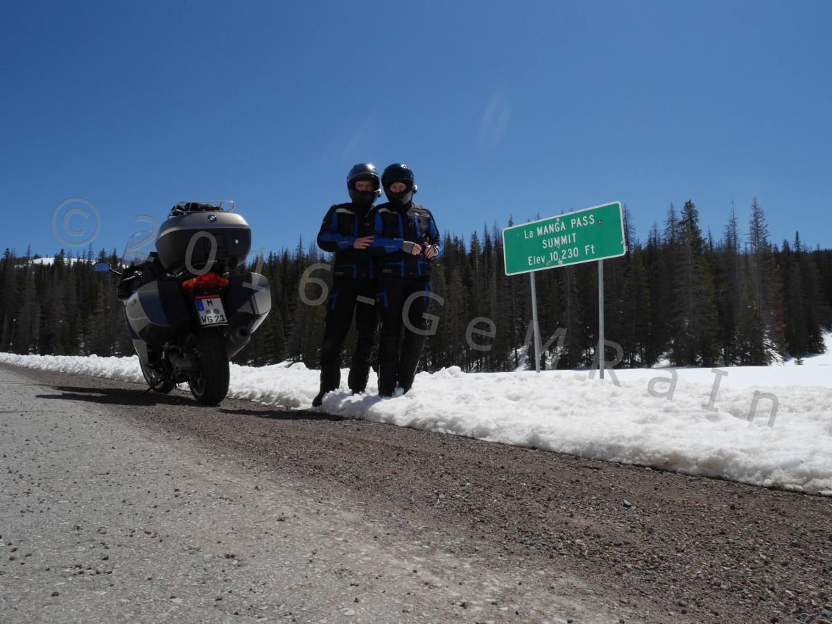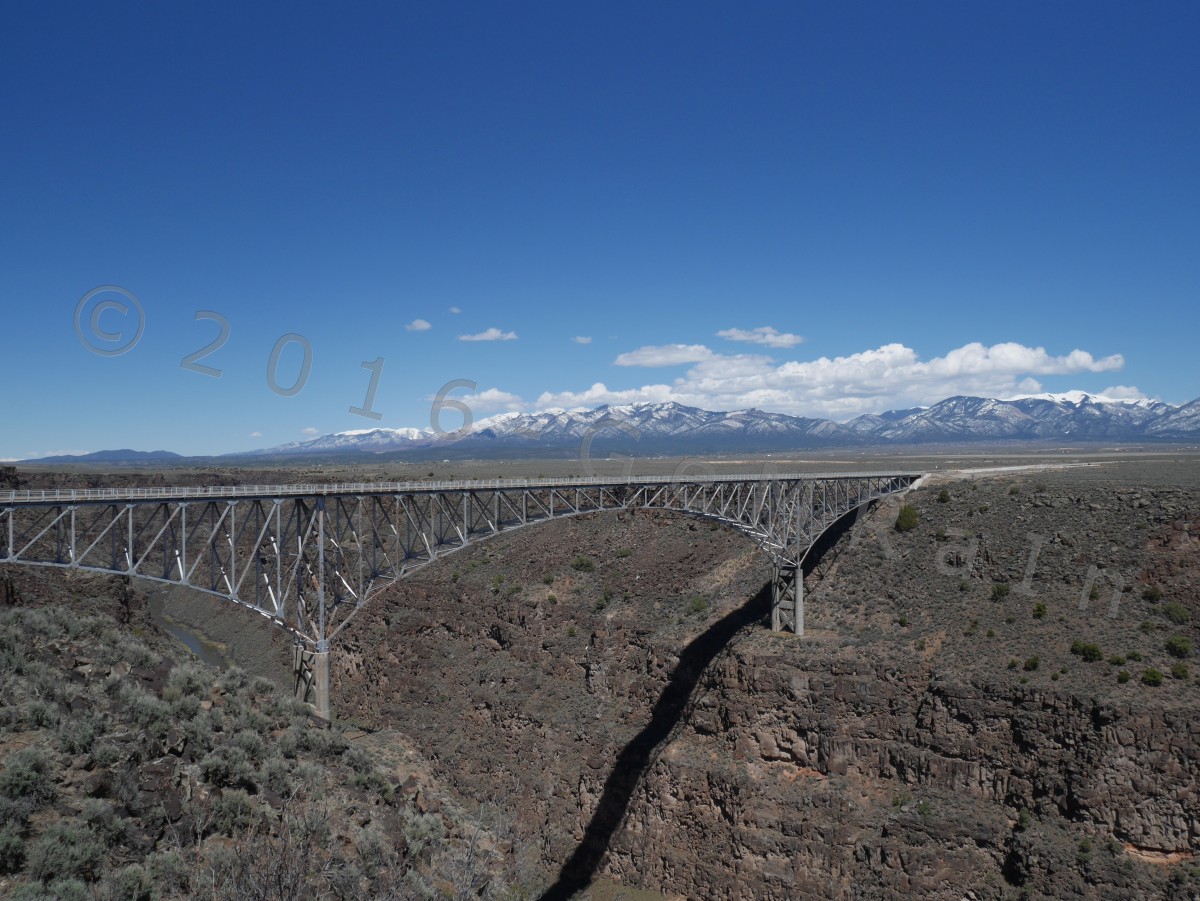 Ausflug 4 (21.4.): Cumbres- und La Manga-Pass und Gorge-Bridge am Rio Grande: Unsere gut 400 km Rundreise führte uns zum ersten Mal nach Colorado in die Berge mit viel Schnee und für Ines zu kalte Temperaturen. Wir sind relativ lange auf einer ca. 2.500 Meter hohen Ebene gefahren und haben zwischendurch unsere ersten 3.000er Pässe überquert. Auf dem Weg dorthin haben wir unseren ersten Coyoten gesehen, er lief vor uns über die Straße. Er ist relativ groß und sieht tatsächlich wie ein häßlicher Hund aus. Außerdem haben wir noch zwei Elch-Kühe und jede Menge Rotwild gesehen, welche aber nachdem wir abgebremst haben, Gott sei Dank nicht über die Straße gelaufen sind. Ein paar Exemplare lagen auch überfahren am Straßenrand. Anmerkung: Nicht von uns überfahren:-)! Zurück in New Mexico sind wir über den gigantischen Canyon des Rio Grande gefahren (Gorge-Bridge). Die Schlucht ist ca. 200 Meter tief, die Brücke ist die 7-höchste der USA.