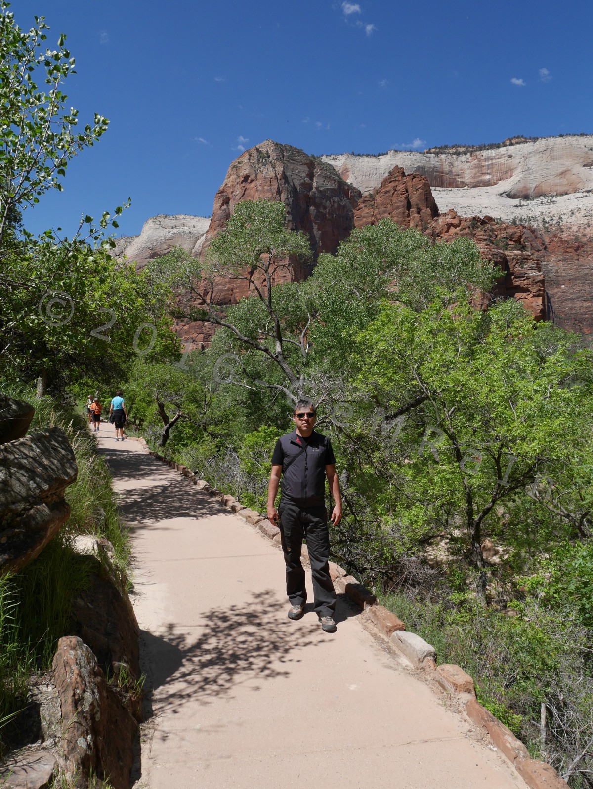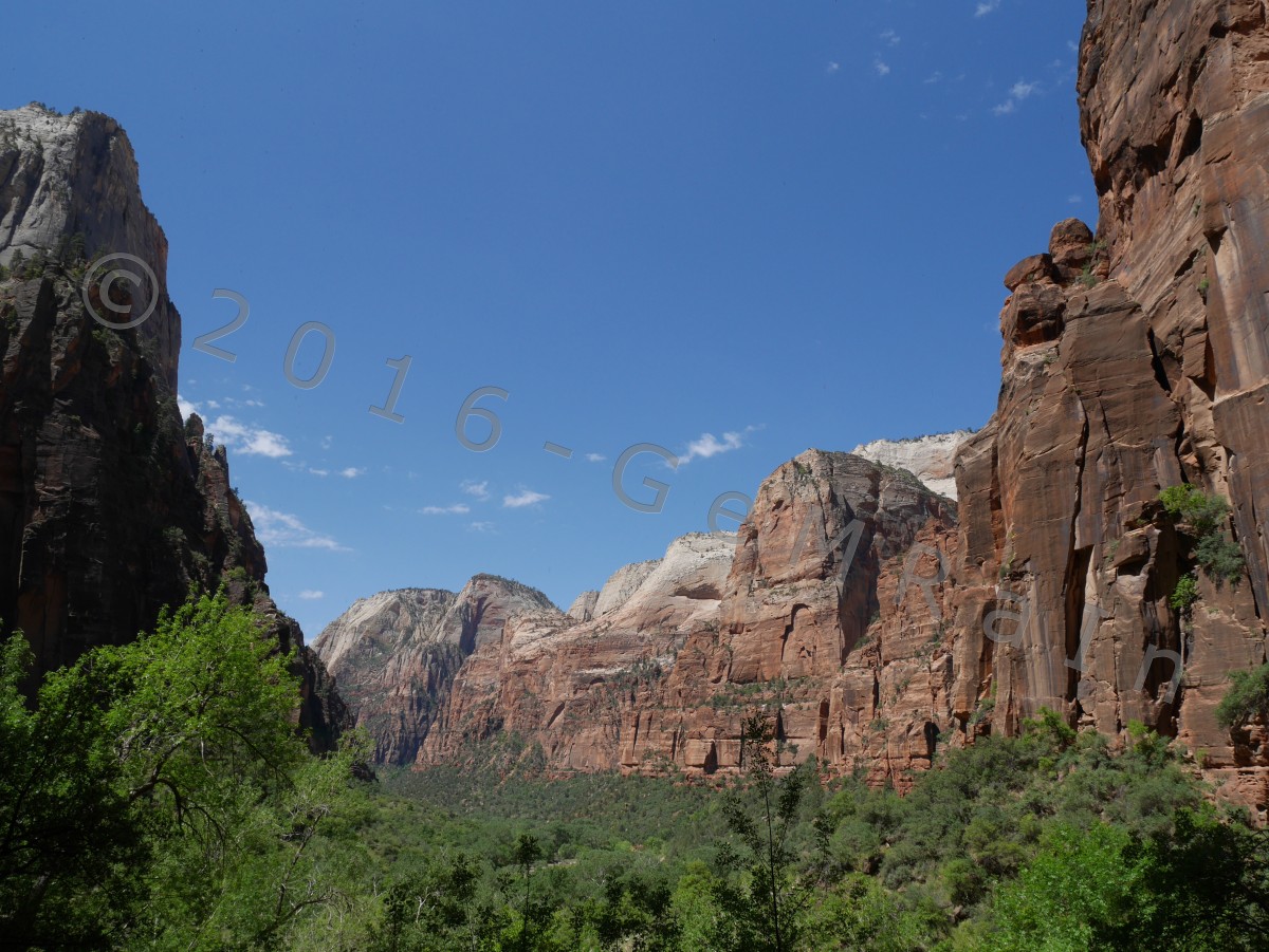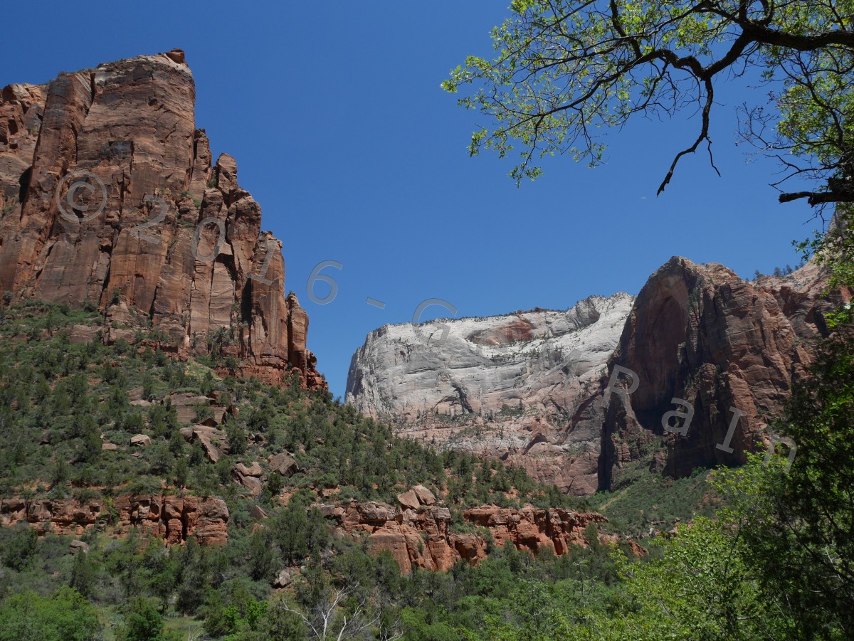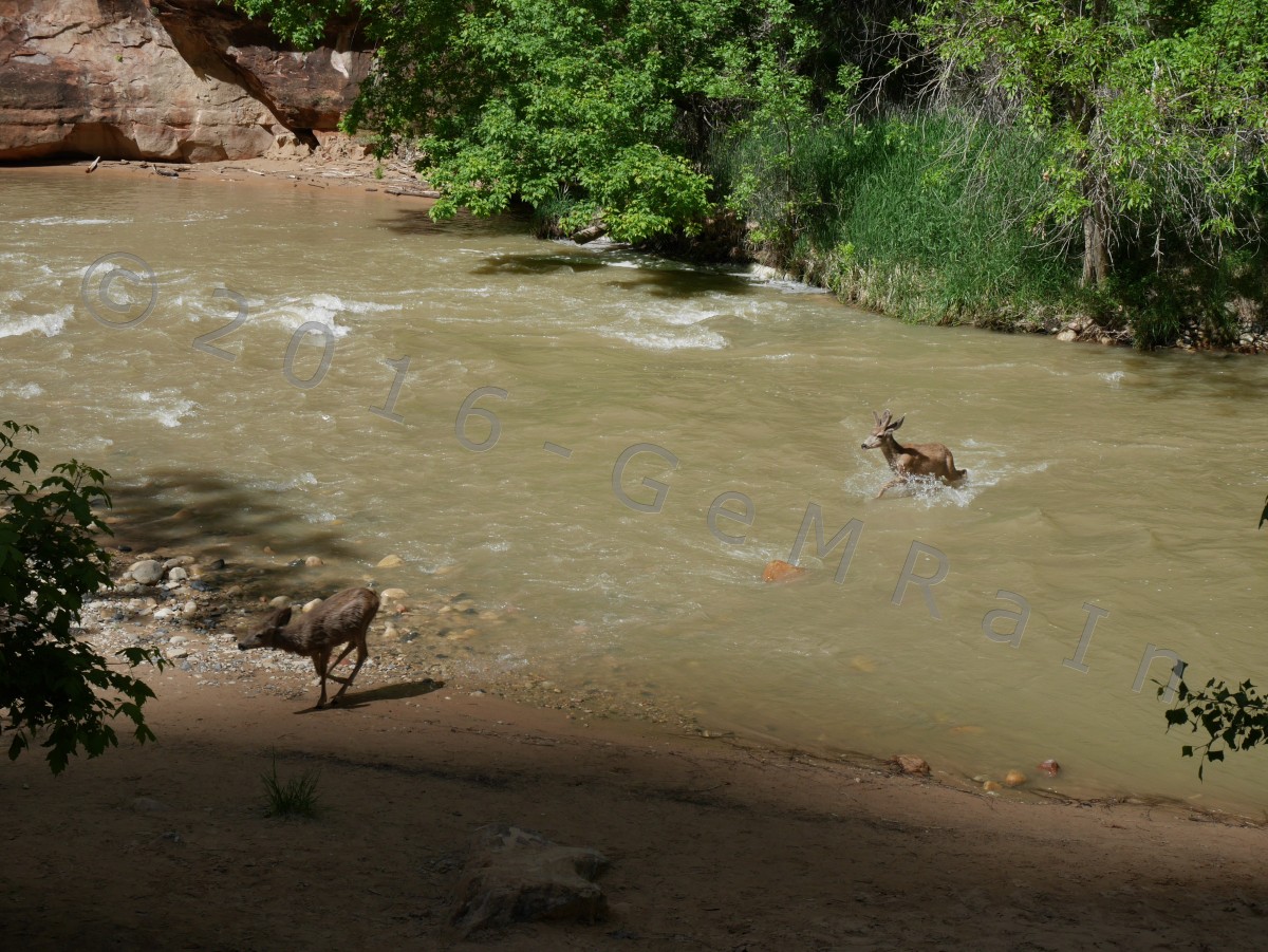 11.05.: Der Zion NP ist ähnlich wie der Arches NP um diese Jahreszeit gut besucht. Wir sind bereits bei unserer Anreise nach Leeds durch den Zion NP gefahren und haben einen Eindruck von diesem schönen Nationalpark bekommen. Die Hauptroute durch den Park ist für den Auto-Verkehr gesperrt, dafür verkehren hier kostenlose Shuttle-Busse. Der Park lädt förmlich zu kleinen und großen Wanderungen ein. Insgesamt haben wir heute drei leichtere Wanderungen unternommen und jede Menge Tiere gesehen. Gleich zu Beginn sind Eichhörnchen auf uns zugestürmt und haben uns um Essen angebettelt. Anscheinend werden diese gerne von Touristen verwöhnt. Jetzt verstehen wir auch die zahlreich aufgestellten Schilder mit der Aufschrift “Don’t feed wildlife”. Ganz idyllisch haben wir wenig später Rehe entdeckt, die zwischen Gräsern Richtung Bach gelaufen sind, den Bach überquert haben und praktisch vor uns wieder über den Weg ins Gebüsch gehüpft sind. Die Ausblicke im Canyon waren wieder mal atemberaubend schön. Eine Wanderung führte uns hinter einem Wasserfall hindurch und hat für die nötige Abkühlung gesorgt.