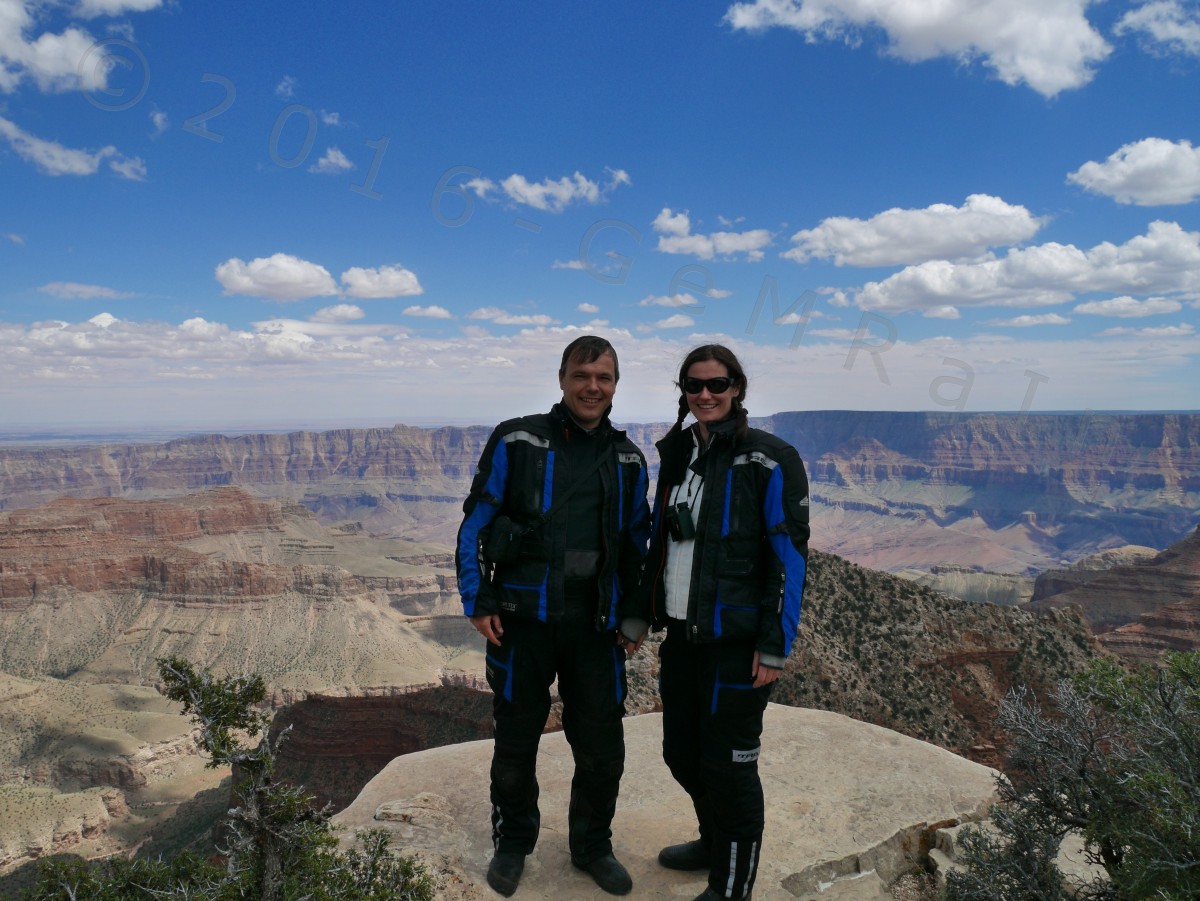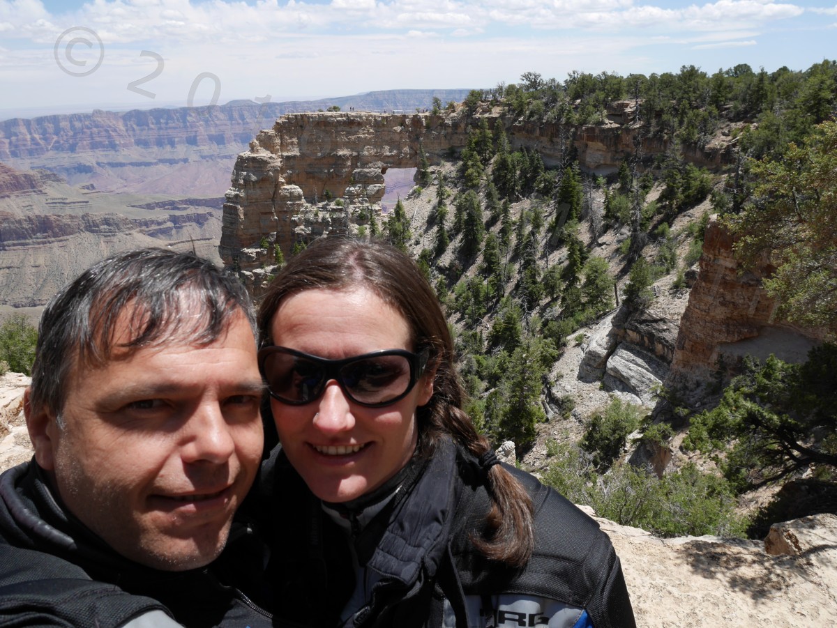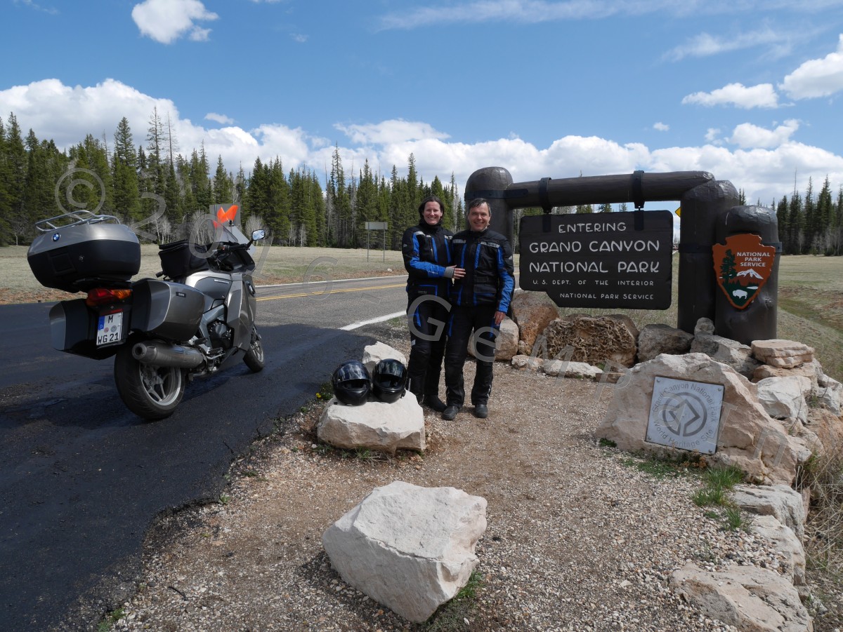 15.05.: Das Finale – der North Rim des Grand Canyon: Der nördliche Einstieg zum Grand Canyon, North Rim, hat heute die Saison 2016 eröffnet und wir waren dabei! Nachdem wir einige Tage mit über 30 Grad unsere Terrasse genießen konnten, sind wir heute auf der Nordseite des Grand Canyon wieder vereinzelt an Schneefelder vorbeigefahren. Auf einer Höhe von 2.695 m waren die Temperaturen entsprechend kühl. Hier wurden wir zum ersten mal vor Büffeln gewarnt. Von den Aussichtspunkten der Nordseite überblickt man nicht nur andere Bereiche dieser unglaublichen Schlucht, sondern genießt die Aussicht mit mehr Ruhe als von der hoch frequentierten Südseite. Zudem ist es die definitiv schönere Motorradstrecke. Auch wissen wir jetzt warum der Grand Canyon, Grand Canyon heißt, unbeschreiblich groß, tief und einzigartig. Die Aussichtspunkte Angels Window und Cape Royal haben uns in ihren Bann gezogen. Wir hätten dort wieder mal stundenlang sitzen und die Aussicht genießen können.