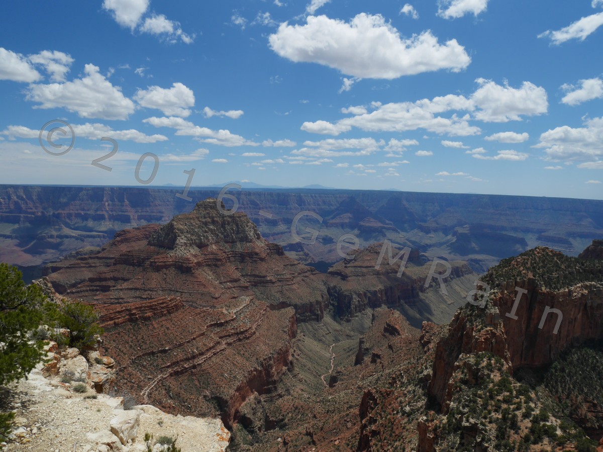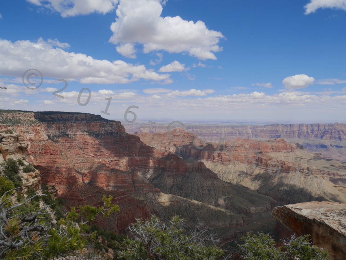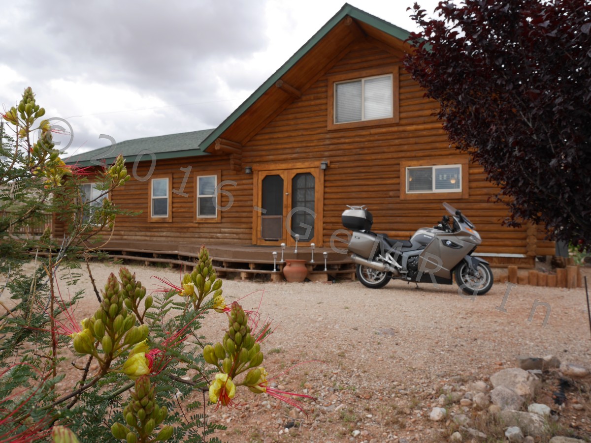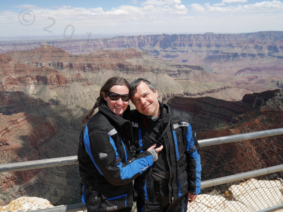 15.05.: Das Finale – der North Rim des Grand Canyon: Der nördliche Einstieg zum Grand Canyon, North Rim, hat heute die Saison 2016 eröffnet und wir waren dabei! Nachdem wir einige Tage mit über 30 Grad unsere Terrasse genießen konnten, sind wir heute auf der Nordseite des Grand Canyon wieder vereinzelt an Schneefelder vorbeigefahren. Auf einer Höhe von 2.695 m waren die Temperaturen entsprechend kühl. Hier wurden wir zum ersten mal vor Büffeln gewarnt. Von den Aussichtspunkten der Nordseite überblickt man nicht nur andere Bereiche dieser unglaublichen Schlucht, sondern genießt die Aussicht mit mehr Ruhe als von der hoch frequentierten Südseite. Zudem ist es die definitiv schönere Motorradstrecke. Auch wissen wir jetzt warum der Grand Canyon, Grand Canyon heißt, unbeschreiblich groß, tief und einzigartig. Die Aussichtspunkte Angels Window und Cape Royal haben uns in ihren Bann gezogen. Wir hätten dort wieder mal stundenlang sitzen und die Aussicht genießen können.